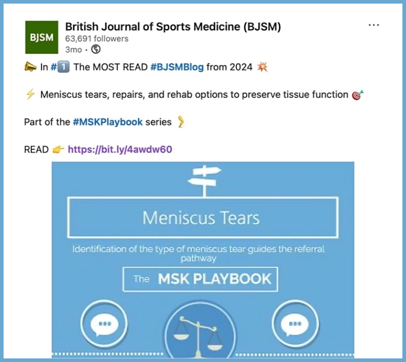 We’re proud to be featured in the British Journal of Sports Medicine as the #1 most-read BJSM Blog of 2024. Our work on meniscus tears, repair strategies, and rehabilitation options was recognized as a leading resource for preserving tissue function and guiding clinical pathways.
